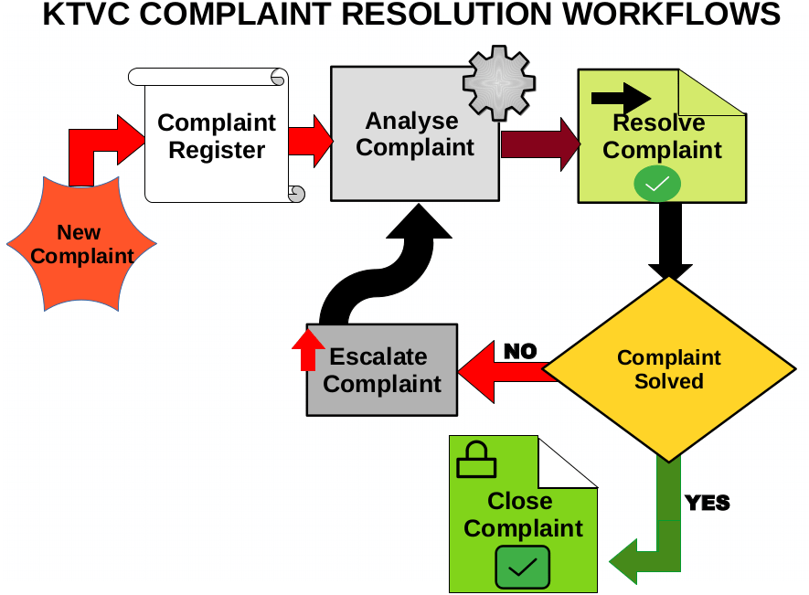 We at KTVC believe in amicable resolution of conflict that can arise during our operation. we have documented the workflows for the complaint handling mechanics as shown below. To initiate a complaint, you can drop the complaint to the complaint / suggestion box in the admin and tuition complex, or get in touch with the principal or file the complaint to the office of the Ombudsman.
