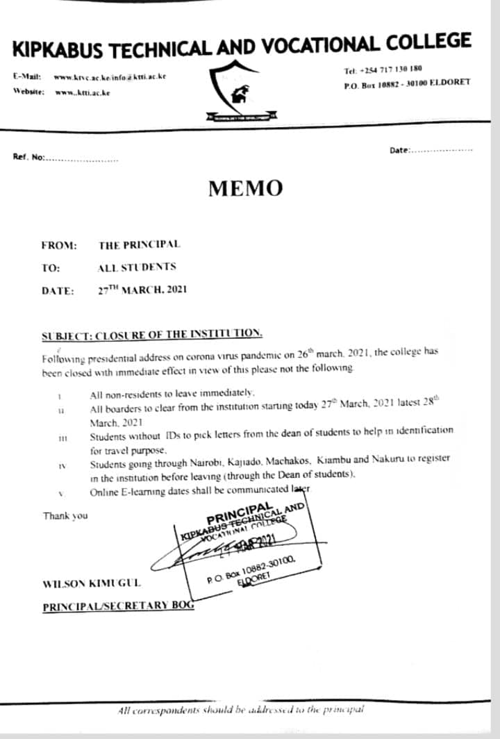 In line with the presidential directive on suspension of physical training in reaction to surge in COVID19 infections, Kipkabus TVC has been closed. Irrespective of this, plans are under way to have elearning which already was under pilot implementation to be implemented institution wide.